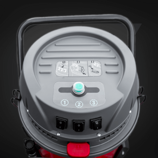 Trzy wysokowydajne silniki generują aż 620 m³/h przepływu i 200–240 mbar podciśnienia. Bez problemu zbiera wodę, szlam, błoto, a także suchy pył przy szlifowaniu i cięciu.