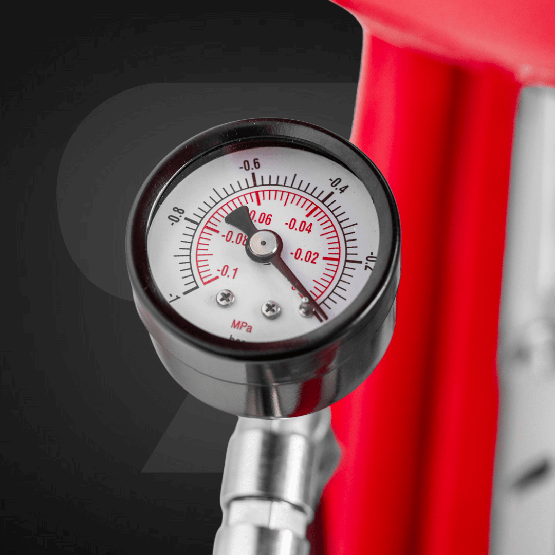 Czytelny manometr umożliwia stałą kontrolę poziomu próżni, a zawór odpowietrzający pozwala na szybkie i kontrolowane zwolnienie podciśnienia po zakończeniu pracy.