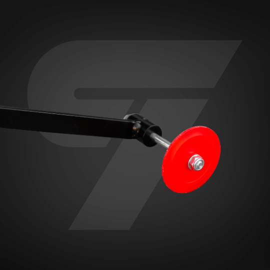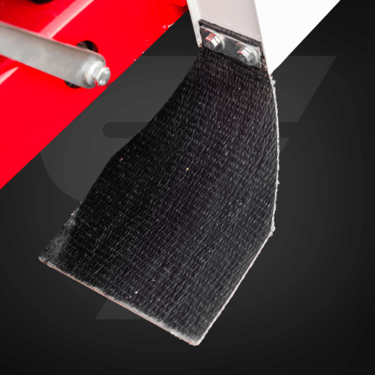 Napęd tarczy realizowany jest przez szeroki pas wielorowkowy, który minimalizuje wibracje i zapewnia płynne przeniesienie momentu. Regulacja napięcia odbywa się szybko poprzez wahadłową platformę silnika.