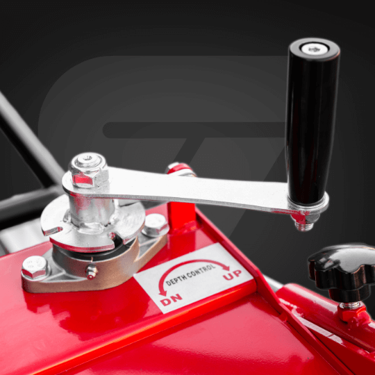 Mechanizm regulacji głębokości z gwintem prostokątnym i siłownikiem hydraulicznym znacząco redukuje siłę potrzebną do operowania korbą. Precyzyjne ustawienie i blokada co ¼ obrotu.