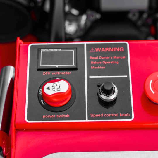 Elektryczny napęd zasilany dwoma akumulatorami 24 V umożliwia płynną regulację prędkości za pomocą potencjometru. Operator dopasowuje tempo jazdy idealnie do materiału – bez wysiłku i bez szarpania.