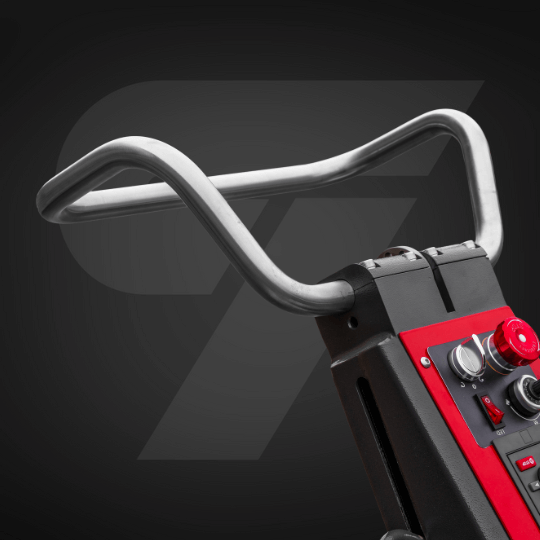 Regulowane ramię główne i osobny uchwyt operatora pozwalają ustawić maszynę w dwóch płaszczyznach. Zmiana pozycji odbywa się dźwigniami – bez odkręcania i narzędzi.