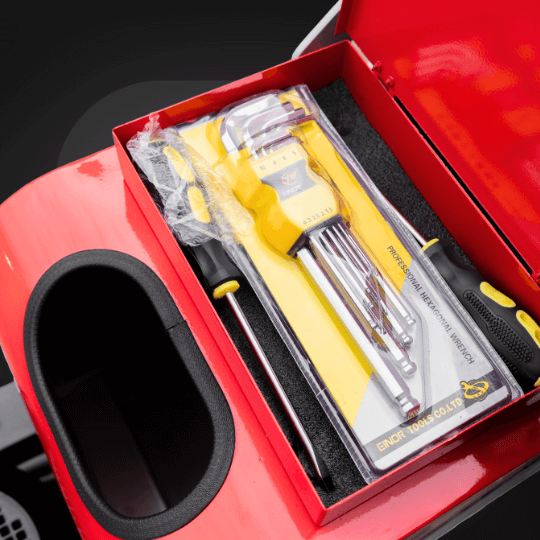 Zintegrowany pojemnik umożliwia przechowywanie kluczy, segmentów i akcesoriów – zawsze pod ręką.