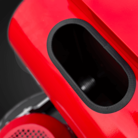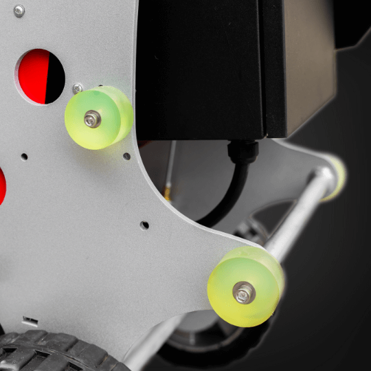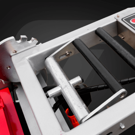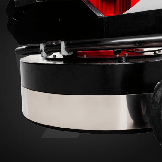 Trwała rama z laserowo ciętej stali, duże koła aluminiowo-gumowe i przyłącze odkurzacza ⌀ 50 mm gwarantują wygodę transportu, czystość pracy i długą żywotność urządzenia. System mocowania segmentów działa na magnes z trzema pinami lub w standardzie Husqvarna.